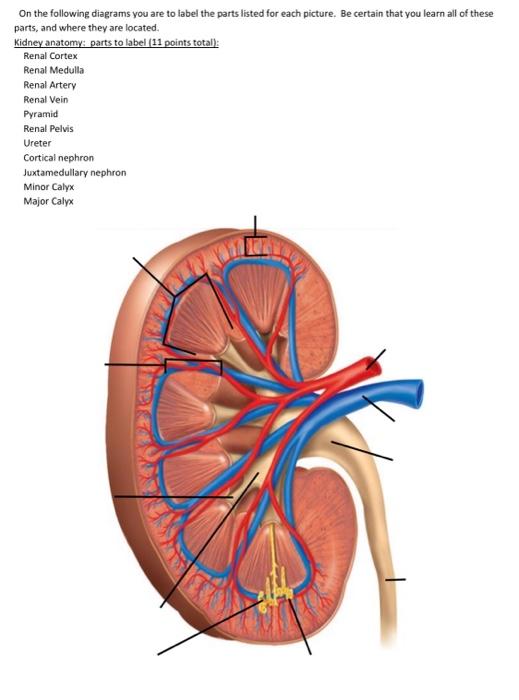 Label the diagram of the kidney and nephron below. Kidney and Nephron Anatomy Quiz - Registered Nurse RN This is a quiz on the anatomy of the kidney and nephron. Before you start studying the renal system for NCLEX, it is very important you understand the basic anatomy and physiology of the kidney and nephron. These structures are affected by disease processes of the renal system and can lead to various signs and symptoms. This quiz and review will start our renal series. Nephron - Structure, Functions and Types of Nephron - BYJUS A nephron is the basic structural and functional unit of the kidney. They are the microscopic structure composed of a renal corpuscle and a renal tubule. The word nephron is derived from the Greek word - nephros, meaning kidney. There are about millions of nephrons in each human kidney. Structure of Nephron Part A - Identifying the structures of the kidney Label the diagram of ... Label the diagram of the kidney and nephron below. Drag the labels to their appropriate locations on the diagram below. Labels can be used once, more than once, or not at all. Part B - Water conservation by the kidney. The kidneys of terrestrial mammals conserve water in the body by concentrating urine. The osmolarity of human blood is 300 mOsm ... Solved Part A-Identifying the structures of the kidney Label - Chegg Part A-Identifying the structures of the kidney Label the diagram of the kidney and nephron below. Drag the labels to their appropriate locations on the diagram below. Labels can be used onco, more than once, or not at all.