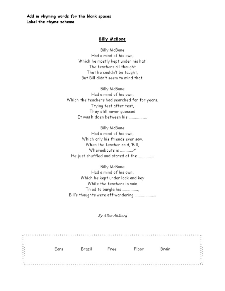 Rhyme Schemes: Write Lyrics That'll Blow Your Fans Away Tip #3 - Rhyme schemes are useful to crank up contrast between the sections within your song. It's perfectly normal to use a six-line scheme in a verse. Then a four-line scheme in a chorus, and a different four-line scheme in the bridge. Tip #4 - Life isn't always even-numbered, either. › bitesize › topicsRhyming poetry - English - Learning with BBC Bitesize - BBC ... If a poem's first and third lines rhyme you should label those A. If the second and fourth lines of the poem rhyme, label these B . Then you can see your four line poem has an A B A B rhyme scheme. Rhyme Schemes And Patterns In Poetry, Basic Poetic Techniques "Sat" and "mat" rhyme, so the same letter is used (A). "Cap" and "lap" rhyme, so the same letter is used (B). Since "sat" does not rhyme with "cap," they cannot share the same letter. Each time a new rhyme set is introduced, a new letter must be used. Take a look at these variations in rhyme scheme. What is a rhyme scheme? - BBC Bitesize Rhyme scheme You can work out the rhyme scheme of a poem by labelling the words that rhyme with each other. It will help you see the pattern of the poem. For example, if a poem's first and third...