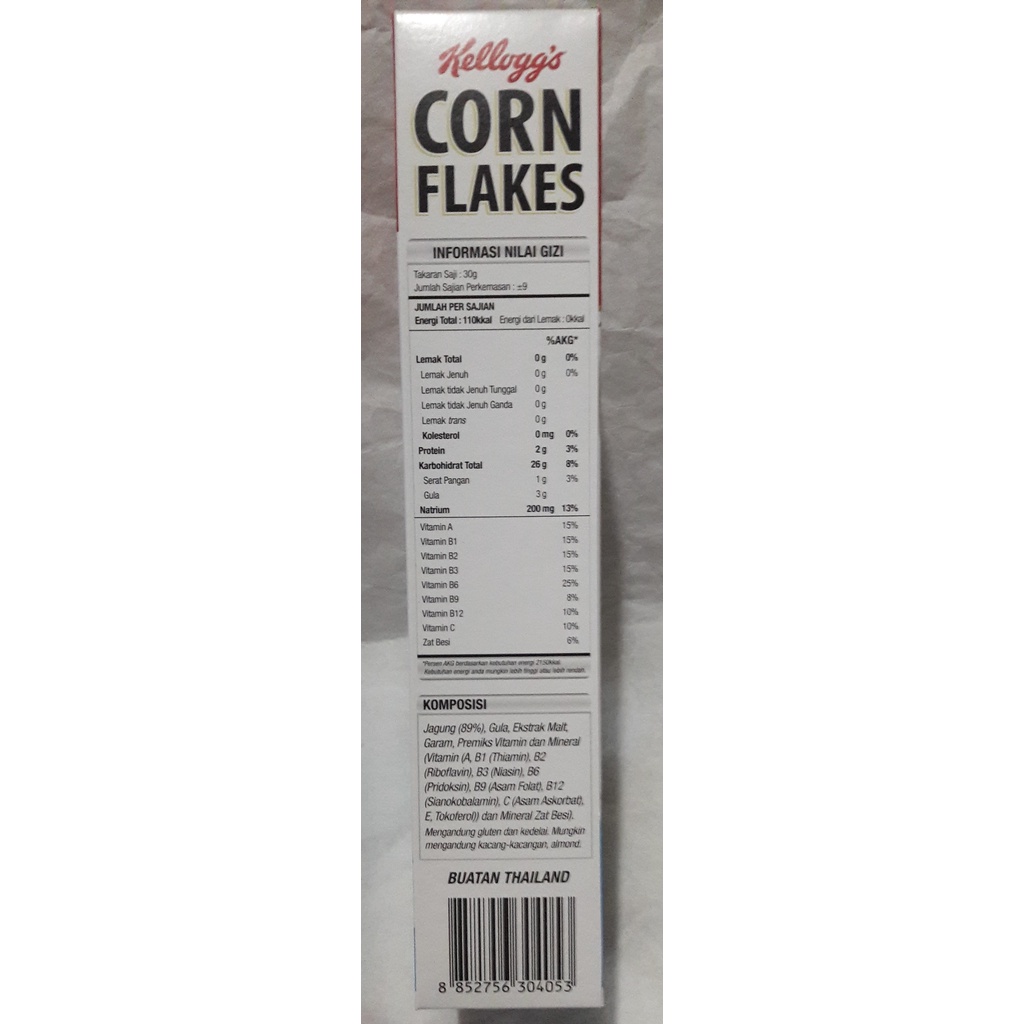 Kellogg's Corn Flakes Cereal Allergy and Ingredient Information Kellogg's Corn Flakes Cereal. SKU/UPC CODE: #038000001130. PRODUCT DESCRIPTION: Quick view * The original & best cereal * Ready-to-eat * Fat free * Ready-to-eat breakfast cereal made from corn * The original and best cereal * Fat free * 100 calories, 0 g total fat, 200 mg sodium and 2 g sugar per serving * 10% of your daily vitamin A & C per ...