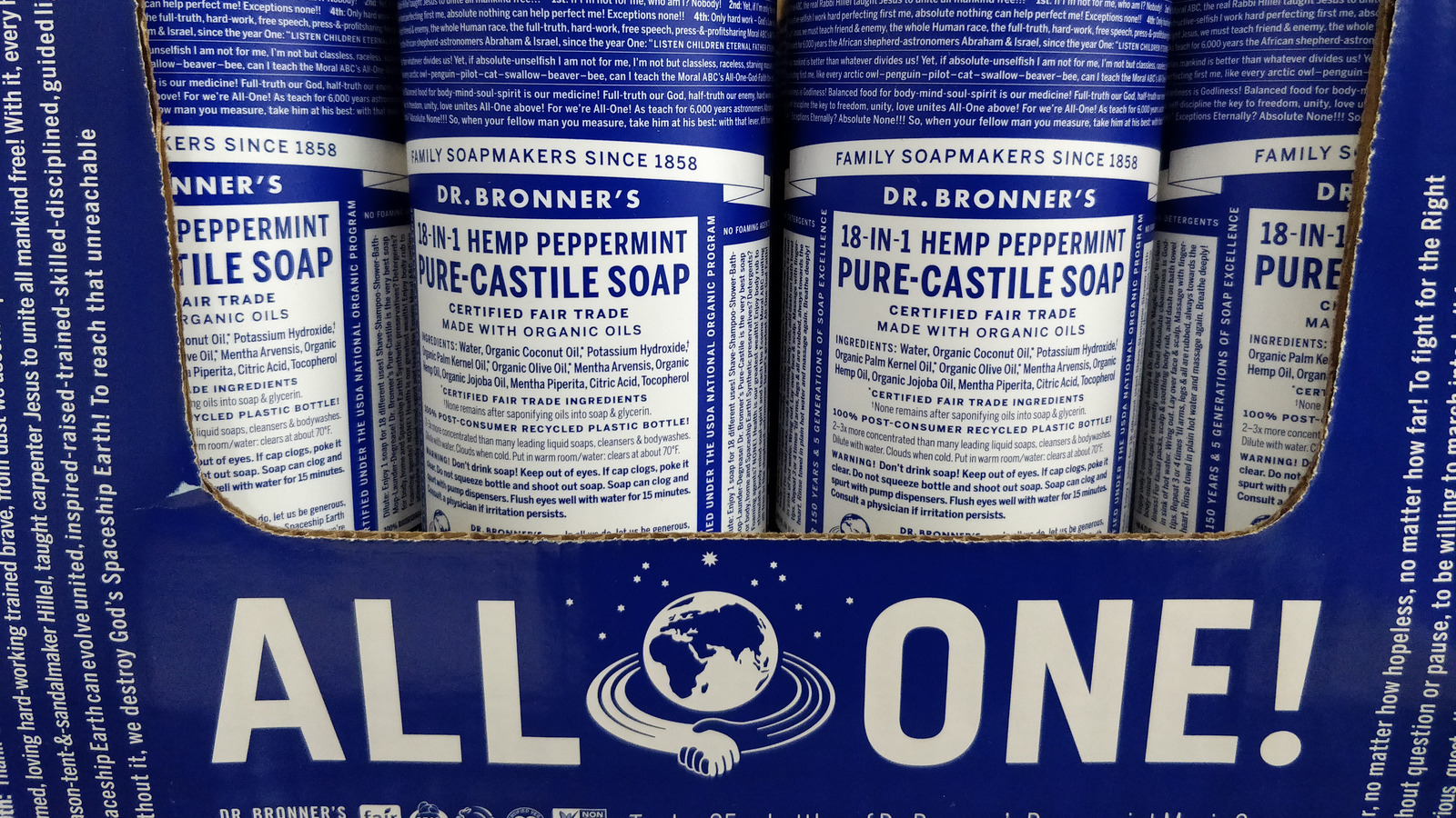 Dilutions Cheat Sheet for Dr. Bronner's Pure-Castile Soap Dr. Bronner's is the top-selling soap in the U.S. natural marketplace. Only the purest organic & Fair Trade ingredients. No synthetic preservatives, no detergents or foaming agents — none! Categories Advocacy All-One Body Care Constructive Capitalism Fair Trade Featured Good Food Green Cleaning Inside Dr. Bronner's Psychedelic-Assisted Therapy