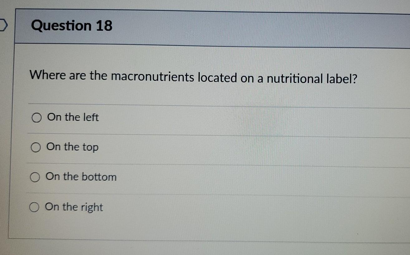 Where are the macronutrients located on a nutritional label? A. on the ... On the top of the nutrition label, after serving size, the macronutrients are listed. After macronutrients, the micronutrients are listed. On the left side, the type of nutrient is written and on the right side the amount of the nutrient present is written. Advertisement Answer 29 people found it helpful avantikar