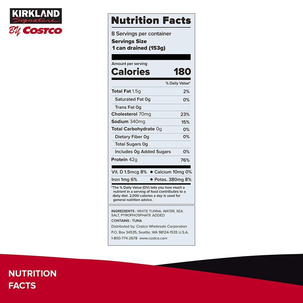Calories in Kirkland Signature Albacore Solid White Tuna in Water and ... Nutrition Facts Serving Size 1 can drained (153 g) Amount Per Serving Calories 190 % Daily Values* Total Fat 3.00g 4% Saturated Fat 0.500g 3% Trans Fat 0.000g Cholesterol 70mg 23% Sodium 340mg 15% Total Carbohydrate 0.00g 0% Dietary Fiber 0.0g 0% Sugars 0.00g Includes 0.00g Added Sugars 0% Protein 42.00g Vitamin D 2mcg 8% Calcium 10mg 1% Iron