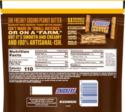 Snickers nutrition label. SNICKERS Bar nutrition facts and analysis. SNICKERS Bar contains 5.2 g of saturated fat and 7.4 mg of cholesterol per serving. 57 g of SNICKERS Bar contains 26.22 mcg vitamin A, 0.3 mg vitamin C, 0.00 mcg vitamin D as well as 0.41 mg of iron, 53.01 mg of calcium, 184 mg of potassium. SNICKERS Bar belong to 'Candy containing chocolate' food category. Snickers Nutrition Facts, Ingredients, Calory, Carb, Sugar Dec 7, 2021 · Snickers Nutrition Facts Nutrition Facts servings per container Serving size 1 Bar (2 oz) (57g) Amount per serving Calories 280 % Daily Value* Total Fat 14g 18% Saturated Fat 5.2g 26% Trans Fat 0g Cholesterol 7.4mg 3% Sodium 136mg 6% Total Carbohydrate 35g 12% Dietary Fiber 1.3g 5% Total Sugars 29g Includes 25g Added Sugars 50% Protein 4.3g SNICKERS Ice Cream Bar, 2.8 oz | SNICKERS® 21 g Includes Added Sugars 17 g 34% Protein 4 g Vitamins | Minerals: % Daily value Vitamin D 0% Calcium 6% Iron 0% Potassium 4% The % Daily Value (DV) tells you how much a nutrient in a serving of food contributes to a daily diet. 2,000 calories a day is used for general advice.