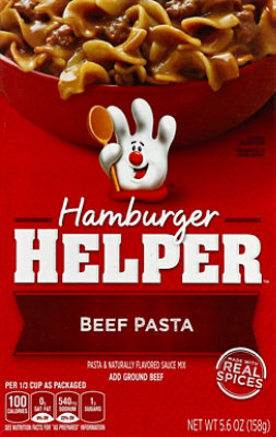 Hamburger Helper Beef Pasta - Shop Pantry Meals at H-E-B Hamburger Helper Beef Pasta · Beef Pasta. Serving Size 0.33 cup as pkgd. Serving Per Container 5 (As pkgd). Amount Per Serving. Calories, 110. %DV. Cholesterol ... Hamburger Helper, Beef Pasta, 5.9 oz box - Walmart.com Ingredients. Enriched Pasta (wheat flour, niacin, ferrous sulfate, thiamin mononitrate, riboflavin, folic acid), Corn Starch, Salt, Wheat Flour.